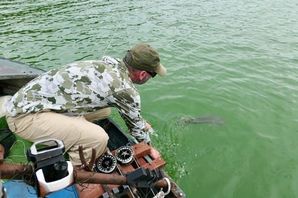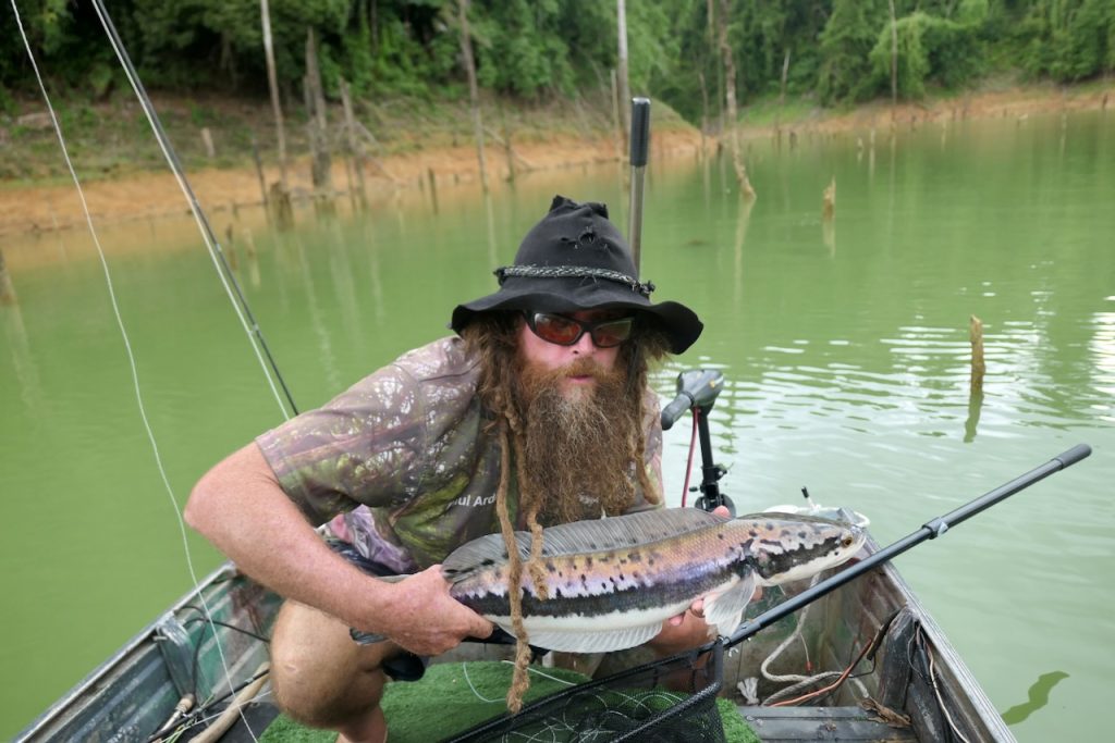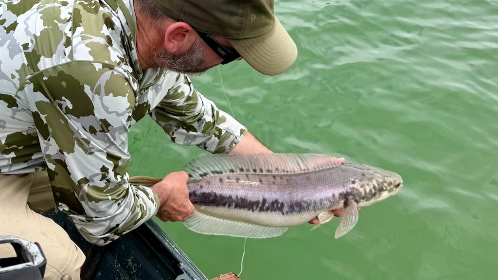 Days 2, 3 and 4 were slow. There were opportunities every day though. Sometimes to free risers, sometimes to snakehead with babies. If you know nothing about this fishery there are 2 main ways to catch snakehead. One is by targeting free risers. Snakehead can breathe air into their lungs by taking a gulp of air from the surface. This gives the angler a visual. If you’re lucky, you’ll see the fish in the murky water before they break the surface to breathe. This will give you an extra moment to prepare your shot. However if you hit the water before they breathe you’ll spook them so you must resist the urge to cast too soon. The shot must be delivered after they breathe. The other way to target them is when they’re with babies. The mother and father snakehead protect their brood of up to a couple of hundred (I’m guessing) baby snakehead. The young ones fizzle on the surface very frequently and so we can track them. They tend to travel from stump to stump if they’re in the shallows so we can try our best to predict where they’re heading and where they’ll pop up next. All the while were waiting for either of the parents to come up to breathe. When they do thats our shot. They are also likely to be in totally open water which can make them a little harder to track. Same as for a free riser, the shot must be fast and accurate. When the fish is released they go back to their family. I watched this happen after Paul caught one off babies. The other parent and babies stay close by (the babies continue to regularly fizzle on the surface as they breathe). Shortly after the release we watched both parents emerge together. Paul believes they have a scent unique to the family to help them to stay together.