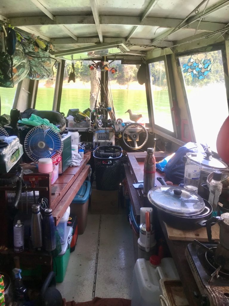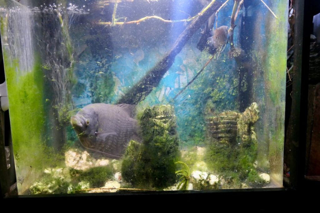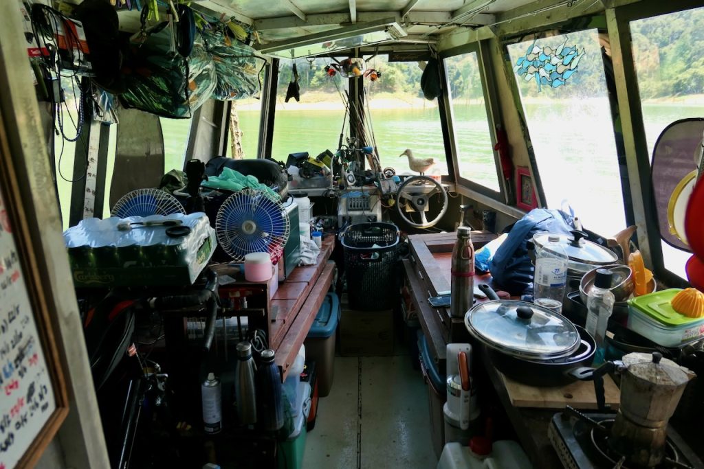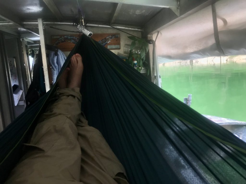 The Battleship is luxurious. When we get back in darkness after a long day there’s a cold beer (or many) in the fridge. Paul has a well equipped galley kitchen where he can whip up some Chinese hotpot or similar. There’s a warm lake which doubles as a bath – just don’t dive in or you may get impaled on a pointed stump! You can sleep in a hammock or a bed – I chose the hammock. Good internet, plenty chargers and battery power. It’s very well set up. There’s a fish tank which doubles as a TV. I spent many hours watching the antics of the little and the large gouramis. They’d eat little chironomid off the surface attracted by the light over the tank. Sometimes they’d get a more substantial fly like a termite. They enjoyed cheese and chocolate too or a bite of one of the plants growing in the tank. Now and again the big one would nudge the little one out of the way but in general they had a peaceful coexistence in the tank. Paul has probably released the large one by now as he was reaching the upper size limit for the tank.
