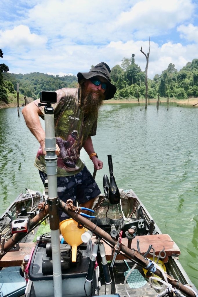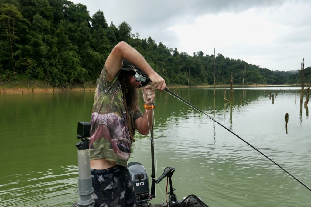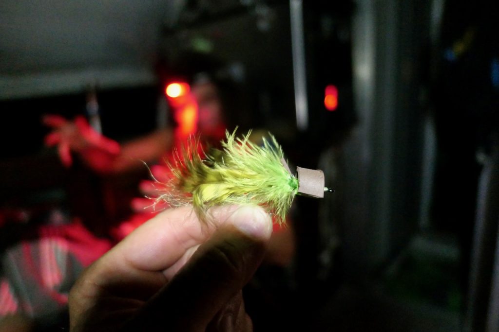 Paul knows this fishery inside out now. He’s been there 10 years and fished it over 3000 days. He understands the fish and the fishing, boat handling too. Whether it’s manoeuvring the boat around stumps or tracking a snakehead on babies, Paul’s boat handling is second to none. Traveling in pitch black is no trouble either due to his knowledge of the lake. He barely ever hits stumps at speed! I learned a couple of new knots while I was there. Paul fishes the rigs he fishes after thorough testing, so he knows the setups are as strong as they can be – usually factoring in a fuse so the fly line doesn’t break. His snakehead cast is now pretty legendary and is a pleasure to watch him execute it. Fly tying is another aspect. The fly that Paul ties is a popper pattern. It has some lead tied in on the bend of the hook to pull the fly down a bit in the water ensuring the first “gloop” is a good one. The fly itself resembles a frog or a small fish. It’s a pattern that has evolved over time and it works! If you’re thinking about an adventurous, challenging and very different type of fly fishing trip I highly recommend this…