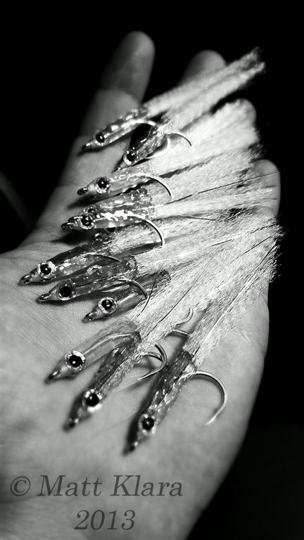 This is where the modern synthetic materials blow nearly all natural materials away. Pick your material wisely and match the translucence of the live bait. Don’t be afraid to go really sparse as well. Test your flies in the water before you tie 50 of them! If they look bad, make a modification.