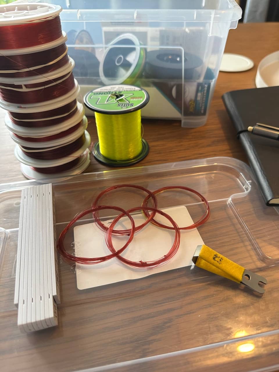 Practicing knots is also good for leader creation. I know how much extra line I must cut when making a section. So I can do these silly leaders with 8 cm of that and 5 cm of that.