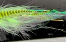 First of all, it’s easy to work with really long materials. The table allows one to place them just as needed and control every aspect of it. It’s also very easy to add several materials to the loop. Here I’ve used craft fur, flash, white “flash” black/chartreuse barred flash and bucktail. The flashes are obviously there for their flashiness, the white and chartreuse/black ones for colour reasons. The craft fur adds the bulk I was aiming for as well as mobility and the bucktail provides some “lift” and flare. When placing especially the craft fur between the wires, the length of the “butt-ends” on one side of the wire defines the final bulk of the “core” of the fly. And if you find it important - it's fluorescent as Hell.