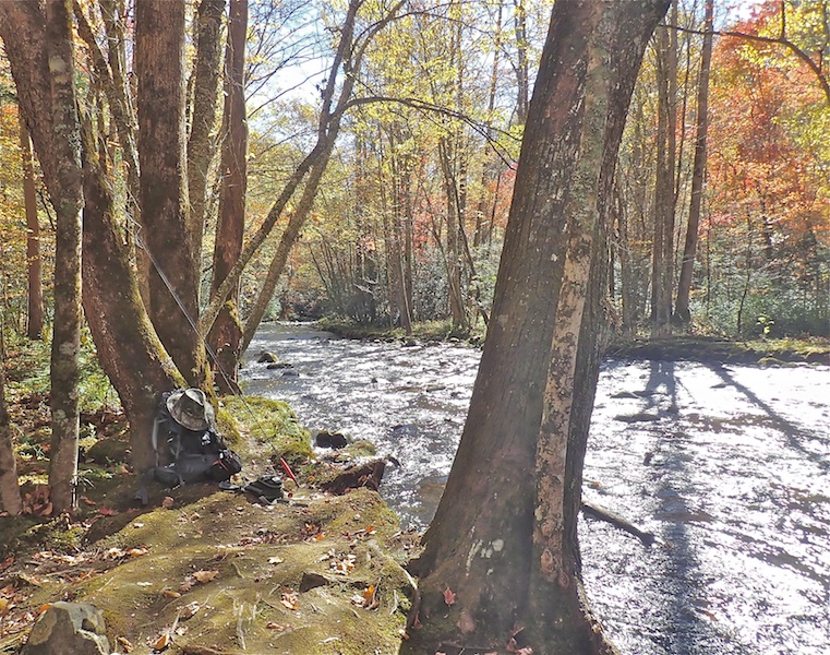 I did catch a handful though, some on nymphs and some on drys. I started with nymphs as that is what was suggested, but not doing so well I switched. When the surface did not produce very well either I wanted to go back, so not knowing what to do, I split the difference and put a nymph on a dropper under a caddis, and that is how I spent most of my time. The funny part was that when I expected the nymph to work, they ate the caddis, and when I thought the dry would work, well… you probably can guess what caught. We did meet one other camper and fly angler who reported some luck and seemed to have a better idea of what to do. We saw no local anglers at all. We had the streams all to ourselves. I expect the locals stayed away because the entire area was packed with large RVs having descended en mass upon the area for the annual visual spectacle of the hills turning color. Few moved more than a dozen feet from their RVs and none were found on the trails.