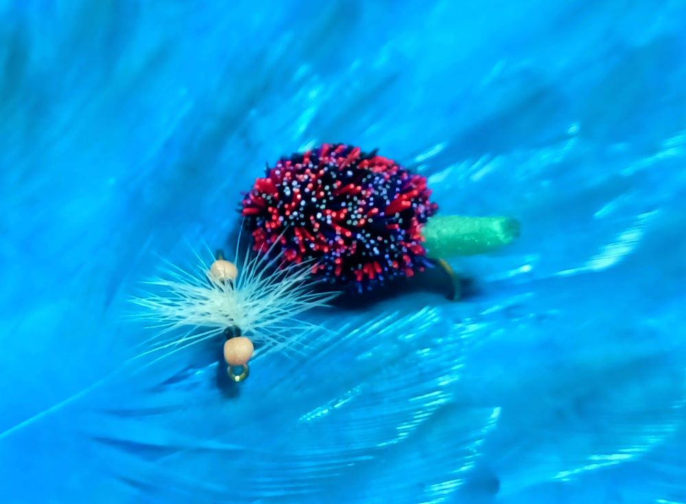 As I mentioned a few weeks ago, berries aren't the only vegatble matter worth imitating. They're my favourite because I can tie an imitation out of deer hair or egg yarn on a big strong hook that won't straighten on a 20lb+ river fish or sink the fly. Seeds of various types are the other offering at the salad bar. They're a bit of a pain at times because they need to float well, but also need to be tied on a stout hook without being too bulky. The redeeming feature is that they don't have as short a window as the mulberries do and turn up for months. If enough of them make it on to the water, the fish will start clooping them off the top. Sometimes they're very easy to catch, sometimes they'd have me pulling my hair out-if I had any! a puff of white CDC works or a white hackle each with a little bit of brown foam.