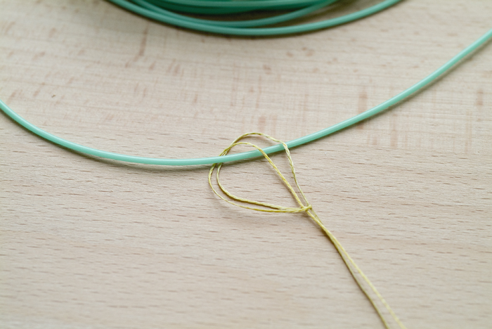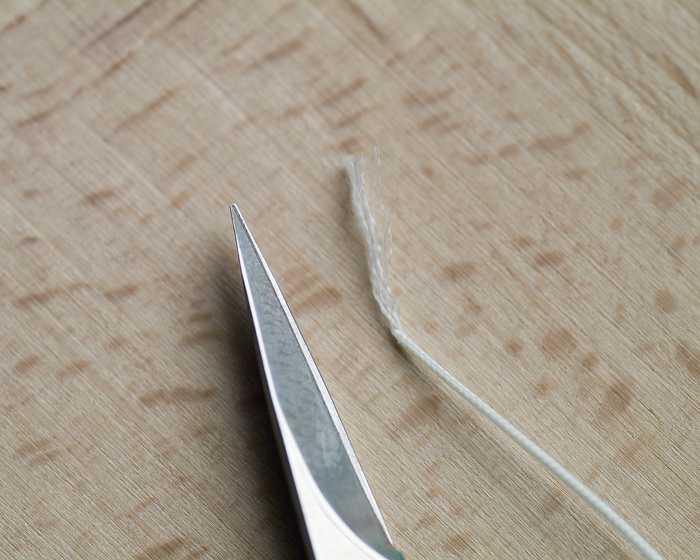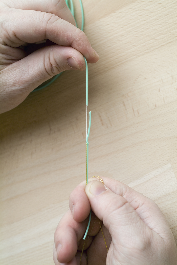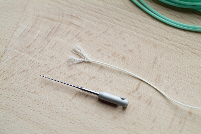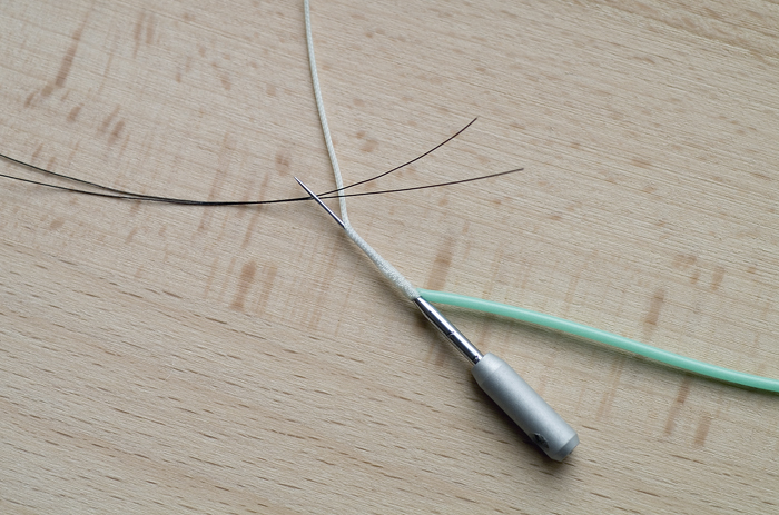 Now insert a sewing machine needle just above where the coating begins, and push it through the core towards the frayed end. Going through 2cm is enough.