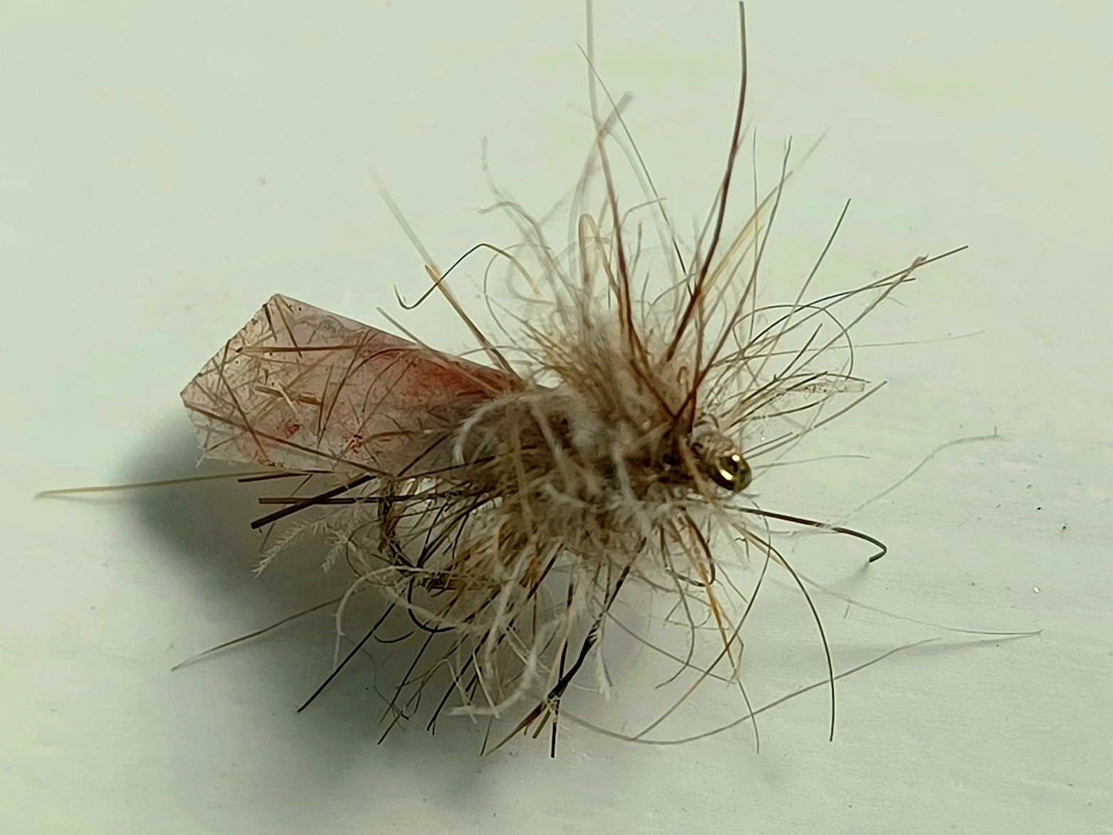 The tape is great, it's light and durable and offers an excellent semi translucent impression of a caddis wing. Unfortunately without a feather it'll stick to itself when you try to fold it, which is where Ollie's method comes in. All you have to do is press a bit of dubbing onto the sticky side of the tape, then fold and cut it to shape, it's quicker than preparing and sticking a feather, it also covers the whole surface of the tape so there's no worry about sticking bits together and wasting a wing. It doesn't matter that you lose the dubbing while fishing, it's done it's job. You're left with a fishing fly that you don't need to start pulling things out of.