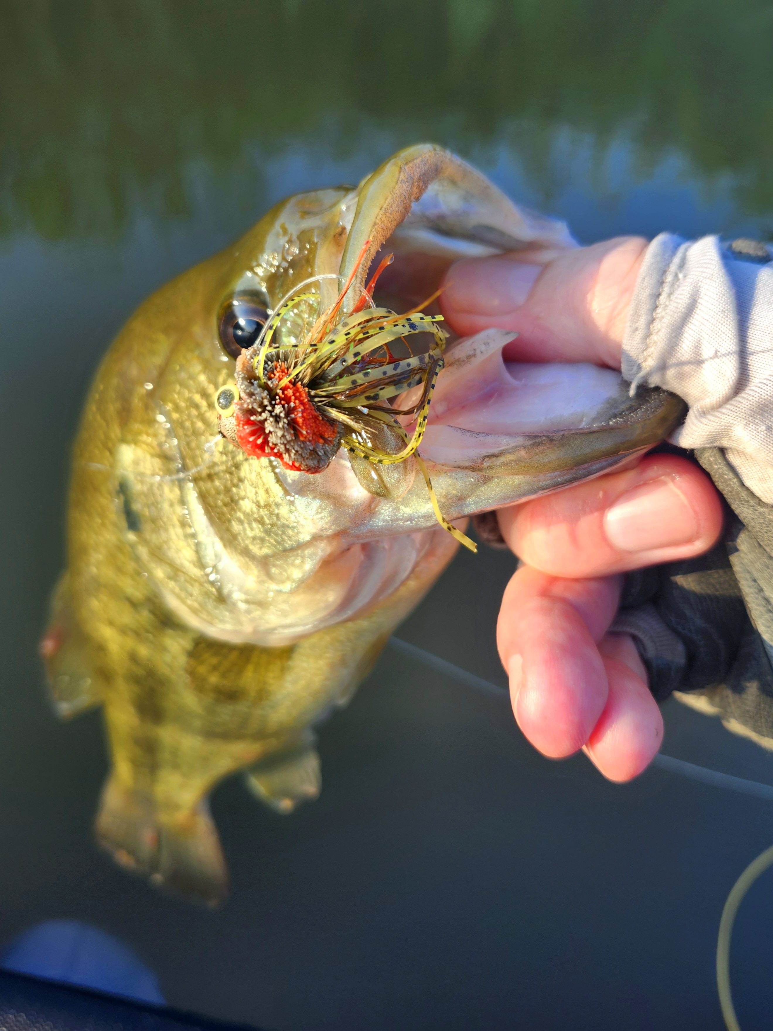 Chuck went west and I went east with a view to fishing till about 9 and then stopping for brunch under a tree before packing up and heading home. I stuck with the baitfish for a while, but nothing was happening so decided to go back to the fat Dahlberg frog and work the shade line of the reeds. Things were quiet for a while and I was starting to wonder if we were on to plums as the light was starting to really get up and I could feel the time running out. When I start having these negative thoughts, I'm always at risk of not fishing as well as I should and really need to force myself to focus, put the casts in and not simply become mechanical in my approach. Luckily for me, just as my head was threatening to go up my arse, I reached a nice bit of standing wood with an overhanging tree. Even without much expectation of a fish, the difficult cast to tuck the Dahlberg as far back as possible under the branches and between the sticks was nice and engaging which focused me properly. I put it in, almost where I wanted, without hanging the fly or line on anything. Usually if I get hung up, the issue I have is the leader or line catching on a bit of stick I didn't see while focusing on the big obstacle. But the Dahlberg was sitting nice, and I straightened my line while I let the ripples fade. I gave it a short bloop and let it float up on a semi-slack line. Doing this with a round Dahlberg allows it to back up as it floats and keeps the fly in the zone much longer than you can with a long pointy one. Another twitch to just bend the legs and swoosh! It was sucked it under. I gave it a solid strip set, held tight and kicked my way back to drag the fish away from the snags, after a quick jumpy fight I lipped a nice little bass. After that I had another few casts in there, but nothing else turned up.