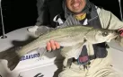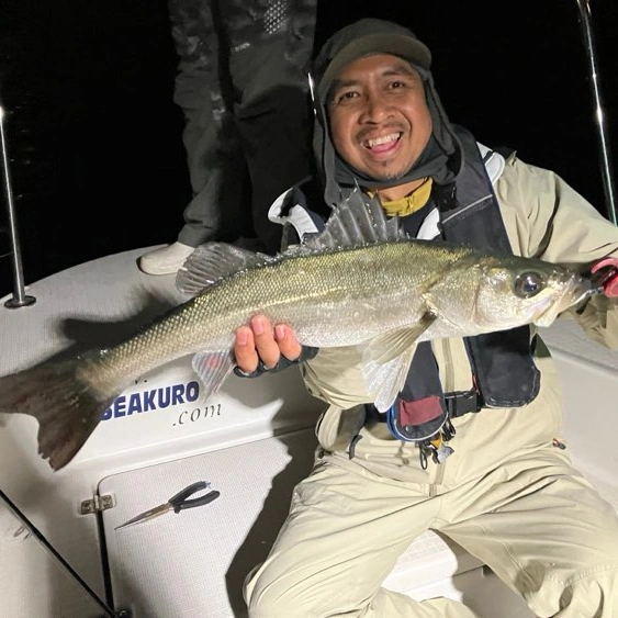 Capt. Masuda was his usual cheery self and happily tested the limits of his English with Ras as we motored straight out to fish around a near shore platform, skipping the usual marks that are closer to the marina. At these platforms we target the lit areas around the legs. The first leg, despite being clearly surrounded by bait, seemed to only have one bass on it that I hooked and lost before it went quiet. A quick move to the main platform produced a couple of fish, with Ras getting a nice fish around 60cm for his first ever Japanese seabass! But again things went quiet pretty quickly. I was starting to wonder if we were still a bit early for the full post spawn return.