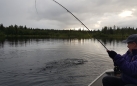 Fourth was success then. Lessons had learned and she handle fish nicely and fish gave us also carousel. It was pulling so hard that our small boat start to go around. Nice handling from Satu and she landed nice rainbow trout. After that some rises next to fly but no strike. Just before we were thinking about finishing there was some good rises and Satu gave few tries. One of those was again success and this time she had jumping machine. Pulling line, jumping, coming towards, jumping, pulling, jumping, carousel, jumping and finally landing. Yes I know when fish jumps you normally give too much pressure but sometimes they just do it even pressure is okay.