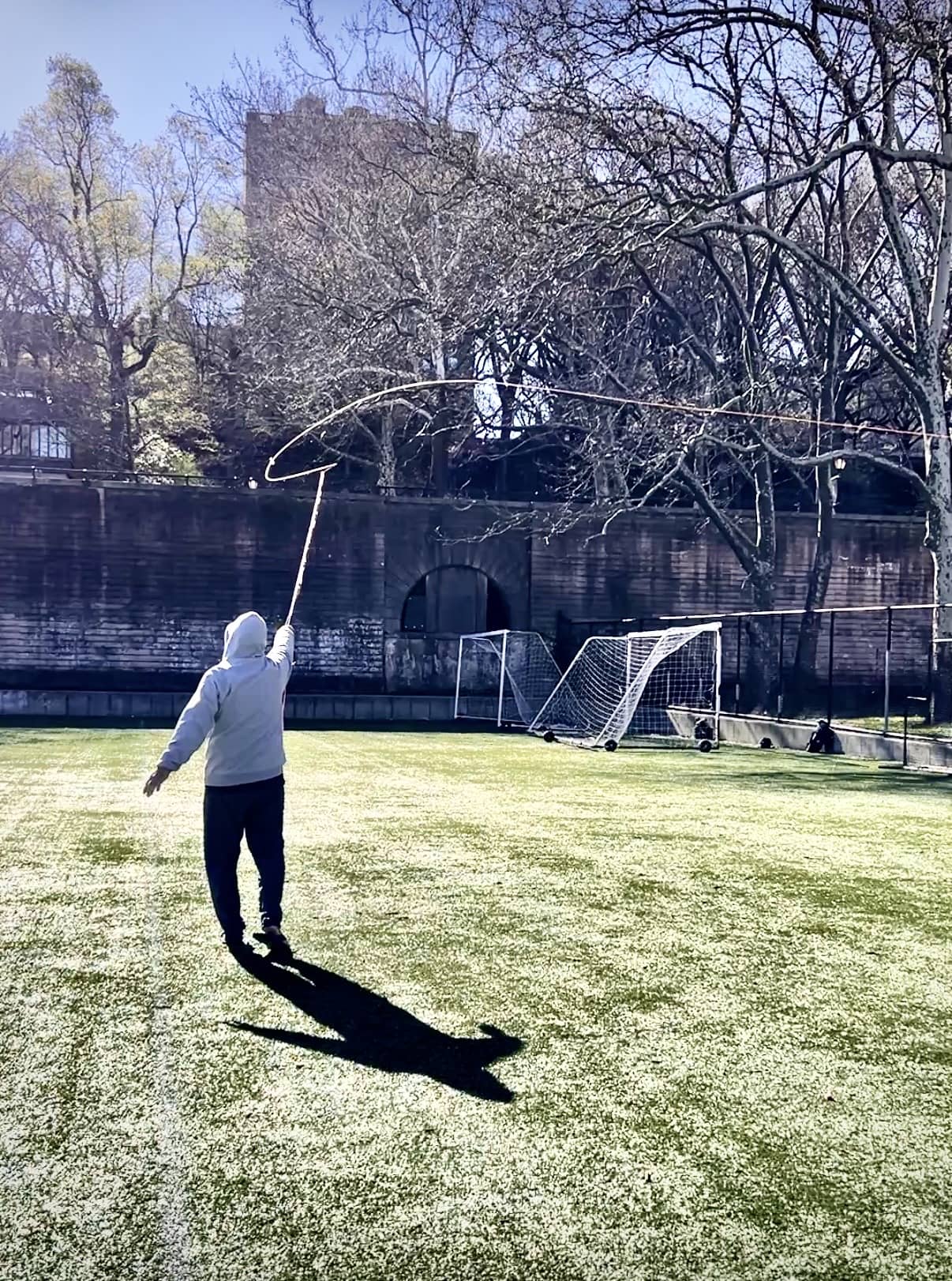There are some nice soccer fields just down the hill from Jackie’s place, in Riverside Park. They’re usually great for my casting practices but this week they’ve been cluttered with kids on spring break. Imagine that! Still I found some corners for some practice up to mid range - maybe 80’ or so. And, unlike LA, some wind to deal with. I’m going to make a stop in Chesapeake Bay to fish for redfish on the way home so I brought my HT10 and have been practicing with my new MED5. Orange line really is easy to see. I performed walking drills, triangle drills and target shooting at white-line-intersections and cones the soccer coaches had set up. I tested various ways to apply power at all angles and made them work feeling “at one” with the rig. I love throwing the MED5 with the HT10. It makes me wonder why I don’t fish like that. What do I like about feeling the rod bend deeply? I mean as a shock absorber for light tippet, yeah. But why else?
