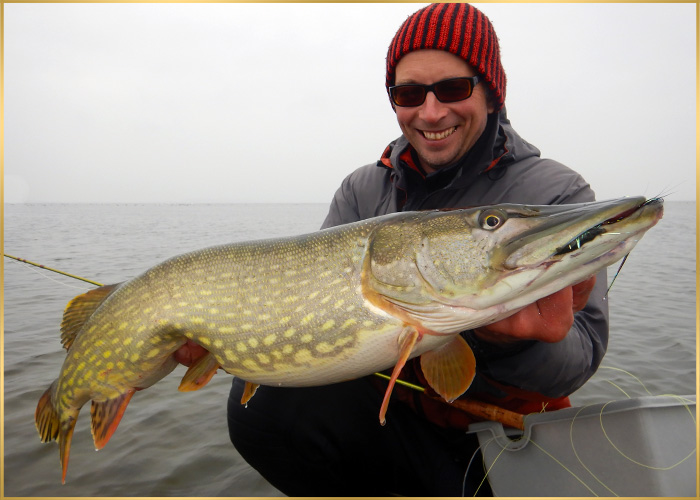 Our last day in pike-land last week was fantastic. Flo and I hooked several great pike. I lost one pretty big one cause he completly inhaled my steel leader and cut the fluorocarbon then. Yes, it was a bit short, obviously. I always tell my students to have at least 40cm of steel in front of their fly. Well, I had 35cm that day, which kind of proved my point! ;) Besides that we landed several fine pike before we went back home.