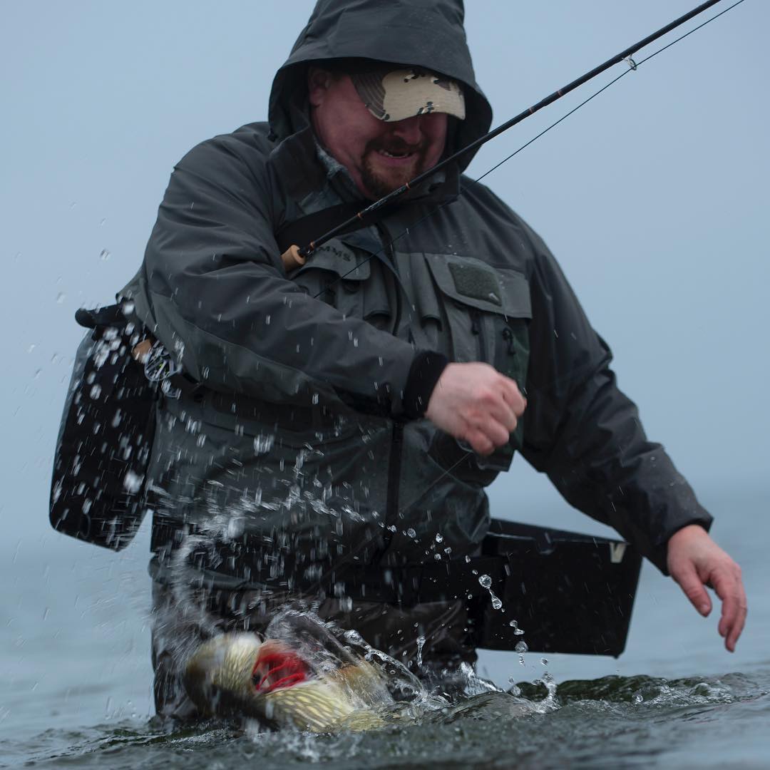 PoD: Landing a pike in the waves on Rügen (Bernd’s territory). Pike have app. 700 razor sharp teeth and that’s challenge enough in itself. Having the line under control in the basket helps a lot too. It was close to freezing just underline it :-).