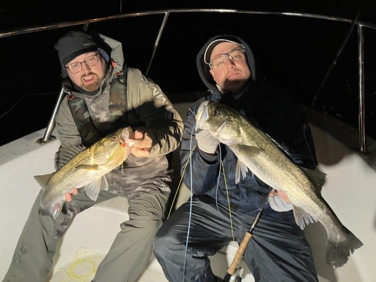 It was a great night out and we surprisingly found bass chasing large gizzard shad in the canal areas rather than out in the open bay. We started fishing small flies looking to pick up a few anchovy feeding fish on the lights and did bick up a couple of average size bass on a 2" albie whore before the canal errupted with shad scattering everywhere. It was phenomenal, I've seen blitzes,but never that many and to that extent in 15 years here. It was amazing, it took a bit of messing around with flies to match the bait size and get the presentation right. I started with a 7 inch semper fleye but the fish were blowing up and turning away from it, ditto a bigger bulkhead deciever, I had a few fish eat a 9 inch T-bone, but didn't hook up. Then Dave went a bit deeper and slower with an SF baitfish which proved to be just the ticket. I switched again to a 9 inch Sedotti Slammer- a real favourite of mine when I need a big baitfish - and we just kept picking up quality fish for the next few hours. We didn't get any real monsters but every fish was in the 65cm-75cm bracket and we did see some bigger fish following to the boat, and chasing the fly in to a musky style figure 8. we had multiple double ups, even between the really active blitzes. It was insane!