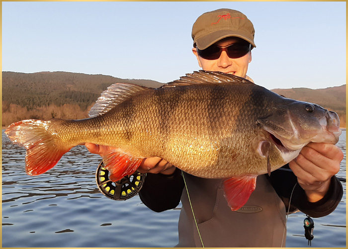 On Monday Aitor, Luis, Jorge and I fished together in one of the fine lakes near Bilbao. We had a brilliant catching day in best weather (blue sky and again 20°+ Celsuis). Luis (the local expert here) managed to catch his second ever perch on fly. It was a record sized fish as you may see in the pictures below. Huge congrats, Luis! I yet never saw a bigger perch! In addition I was able to nail down a grand slam coming along with a fine perch, a nice pike and a proper zander. All in all we had a blast all weekend long!