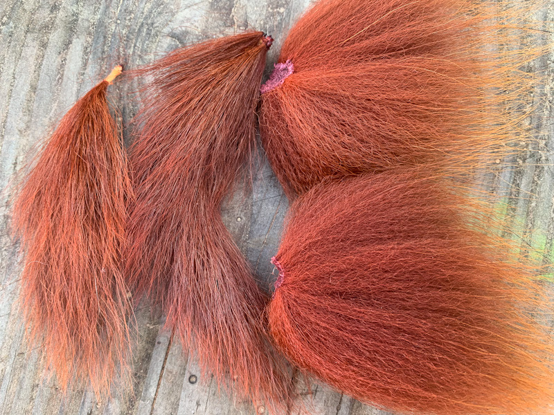 In my quest (see, that’s how serious this is - the Grail… Easy business compared) for the (my?) perfect fiery brown, I quickly began worrying about my soul - had I unknowingly sold it to the Devil? Because I hit what I believe to be the perfect fiery brown in my first attempts (remember from last week, I had my friend Claus on phone? Maybe he’s in fact a Knight Templar?). A lovely reddish brown with a nice “glow” to it. I dyed marble fox and squirrel tail (which I bleached first) and by some (un?)holy intervention, I got it right.