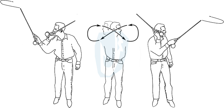 Begin by rotating your body about 45 degrees away from the target, so that the “backcast” area is clearly visible by turning your head slightly. Rotate your rod hand and arm so that the reel is facing upward; this will necessitate lifting your hand about as high as your face. Now make the “backcast” just as if it were a normal forward cast, but aim it high like a normal backcast would be aimed. During the Pause, rotate your arm so the reel is pointing toward the target area and lift (upward drift) the rod so it is in the correct position for making the forward cast. Then make the cast.