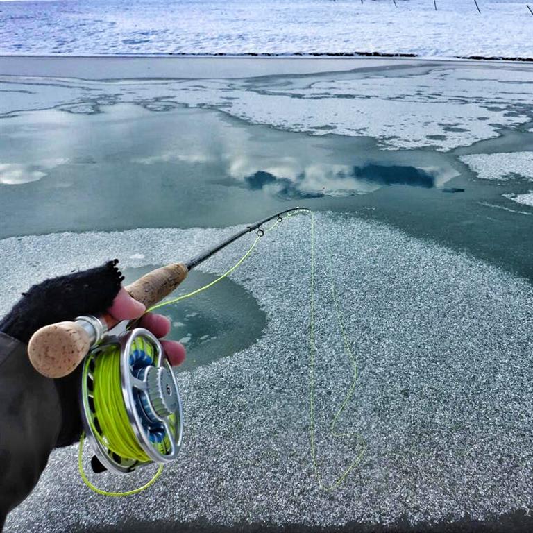 If the ice is still very close to shore, it can be effective to cast parallel to the ice shelf, and retrieve your fly back along the edge of the ice, just like you might do on a weed edge in summer.