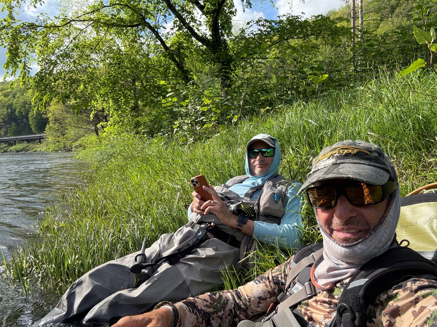Neither did I see anyone contact or euro-nymphing although I understand it’s gaining some popularity here. I met one fellow from New Jersey who fishes these rivers 100 days per year. He was fishing nymphs under an indicator, roll-casting, pulling his flies into his target drift and feeding 30-40’ of line into the drift, covering a lot of water. But no one was catching anything. Unusual for these waters. I managed one parr-marked brown on a dragging emerger but that was it. Our efforts on the Beaverkill were equally unimpressive. After covering a couple of miles of water, we settled into a cool bankside sitz bath (see photo), waiting for a trout happy hour that never came.