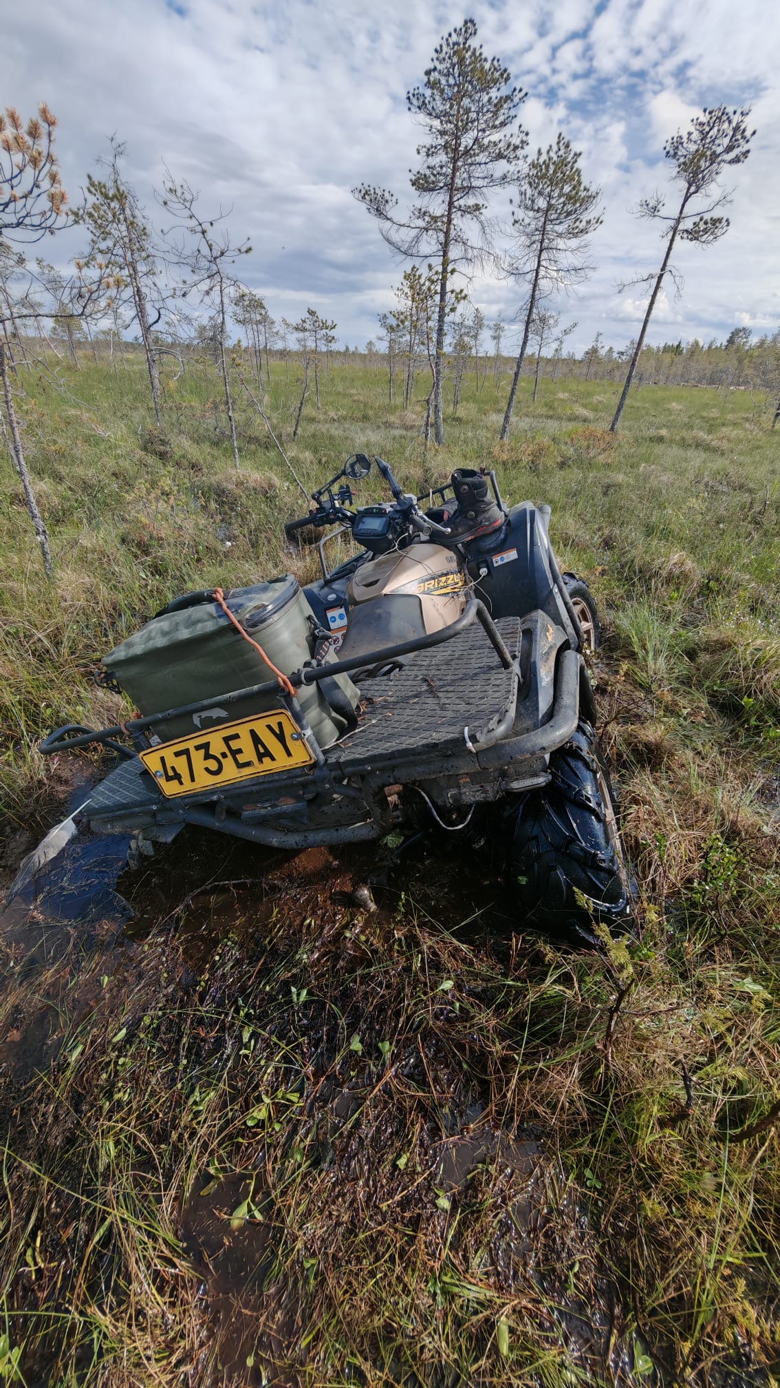 Between quad and tree was 8 meters totally wet area with some solid steps as I thought. I used those to get to the tree and attached winch. On the way back those solid ones weren't solid any more and I dropped knee deep to swamp. I got myself to quad, watched route which was my only option.