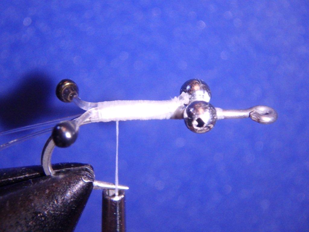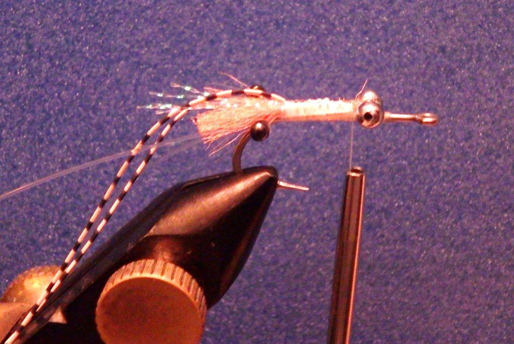 I then tie in two pieces of nylon to act as a weed guard (optional!). I’m sure there could be many pages written on weed guards for flies, currently I’m favouring the front to back loop approach. Getting the ideal compromise between anti-fouling and hooking abilities is a tough call though, certainly I felt that the flies I tied for my last saltwater trip had weed guards that were perhaps too stiff (I always want to blame a lost fish on something rather than ‘bad luck’ though). On top of the nylon I tie in a pair of shrimp eyes, I bend these so they sit a few millimetres either side of the hook shank. I should point out here that I tie in everything butted up against the dumbbell eyes, that way there are no unsightly lumps in the body.