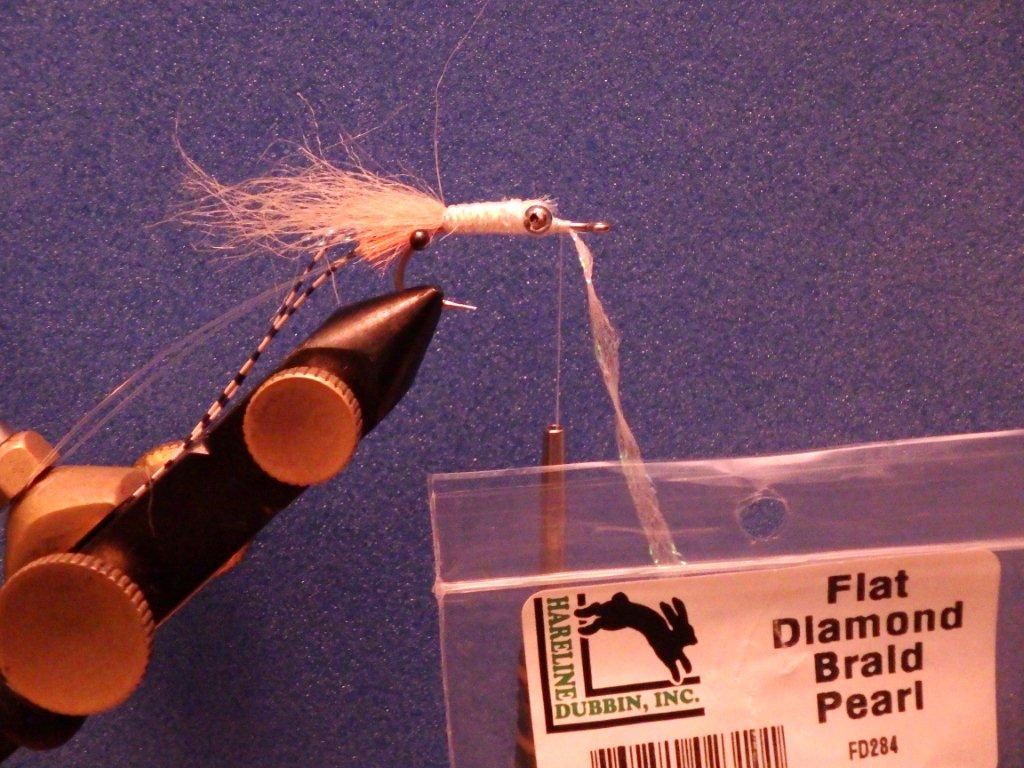 A small pinch of craft fur (or rabbit fur if I’m tying smaller sizes) is added before the body material is tied in. If I’m using a vinyl rib I will also add in a pearl lurex underbody, however that’s not necessary in this example where I’ve used a flat diamond braid. This is wound back to, and around the dumbbell eyes. You’ll notice that I keep the body material in the bag when I tie – this saves on wastage in that I only trim off what I’ve actually used.