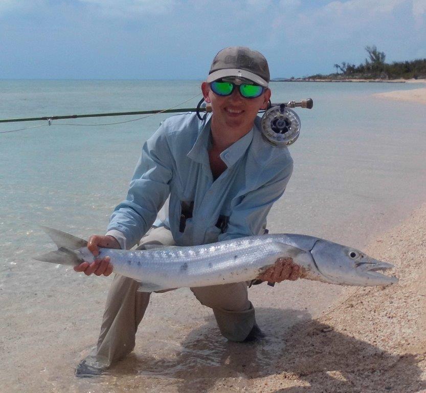 Tracy caught her first barracuda at long last this week, after many years of trying. When I say ‘first barracuda’ I mean a ‘proper’ sized one; she has caught many cudas before (probably hundreds), usually by mistake on a bonefish fly but occasionally targeted by casting a clouser on a toothy critters leader into a likely looking spot. However this was her first adult fish that was patrolling the flat alone.