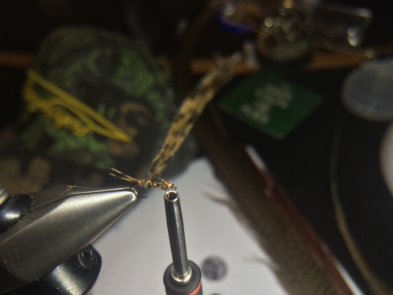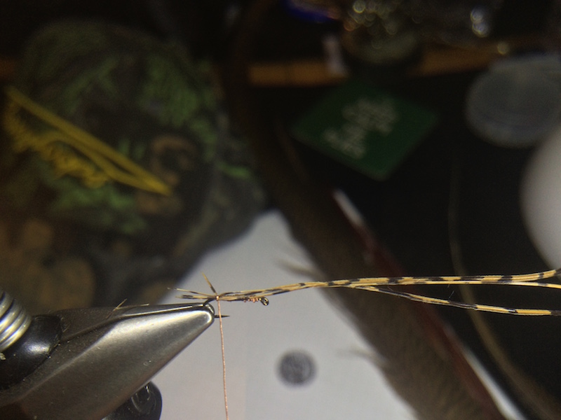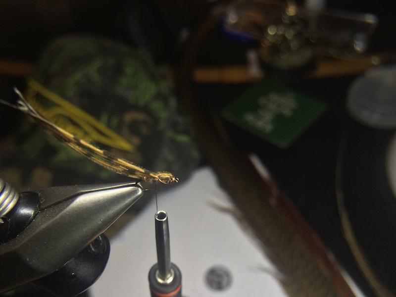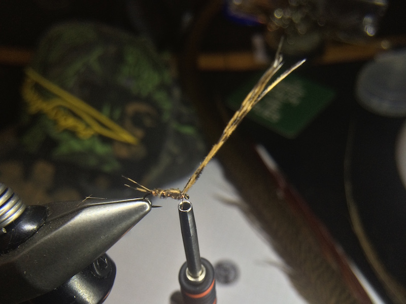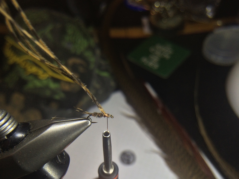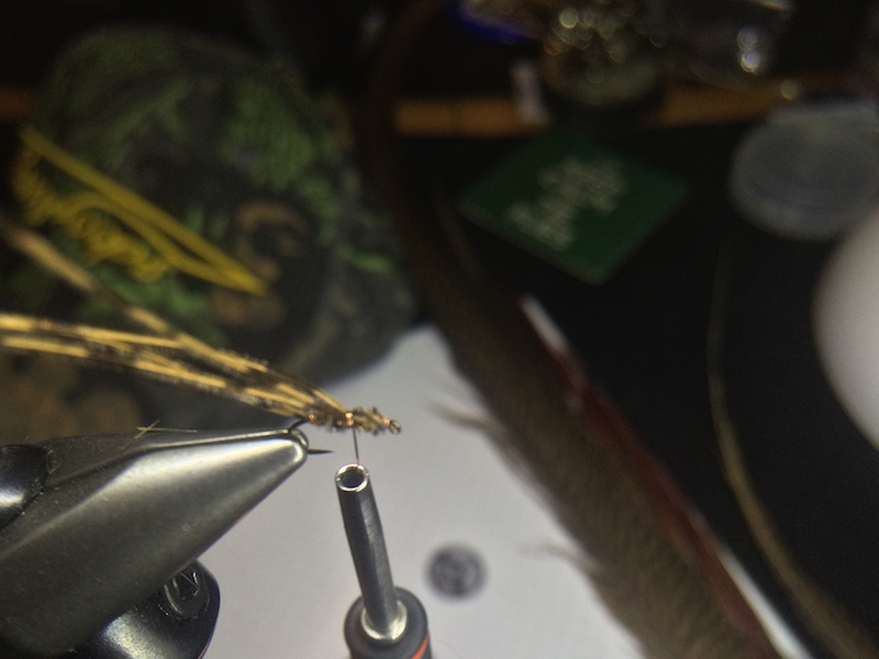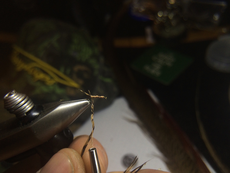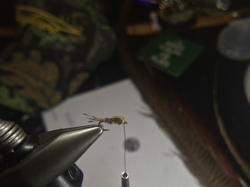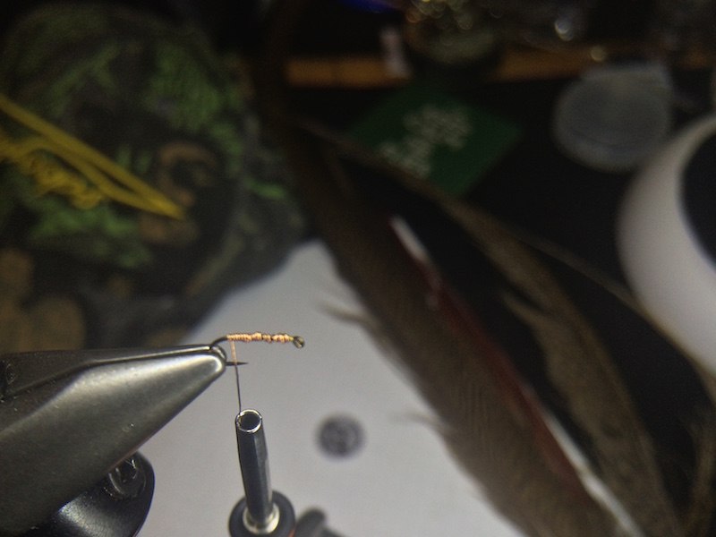 The pattern I want to show you today consist of two materials (plus the hook). Fibers from a pheasants tail feather and thin copper wire. I find it tricky to tie. One really needs to pay attention to the power one applies when winding the materials onto the hook.