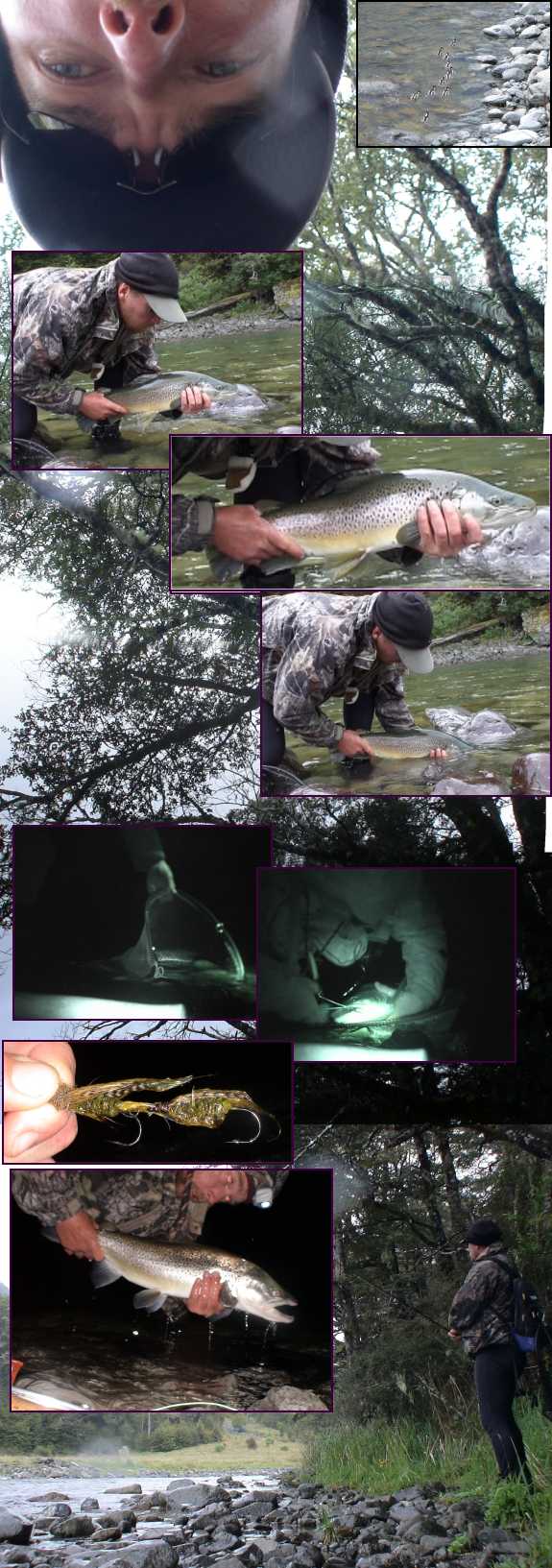 I'm not going to tell you too much more, but do be aware that you can and should fish much heavier breaking strains than normal during the night. With a black marabou lure and muddlers I'll fish 8-10lbs breaking strain (1X) - I'm still careful to degrease the tippet by the way - for the really big flies I'll happily fish 15-20lb tippet.. Always carry two headlamps, but try not to use them at all, and certainly NEVER shine them on the water. If you need to use them, do so well away from the river or hidden from the water. Red light is very good. I would recommend that you MUST know the area you are fishing, and thoroughly explore it during the day. Crossing big rivers at night is challenging, and it's very easy to take the wrong crossing by mistake - I've been down a few - usual advice follows: don't panic, keep your arms down and try to go feet first. And finally out of safety nowadays I fish wearing clear safety glasses - hooking yourself in the eye really is not something you want to do.