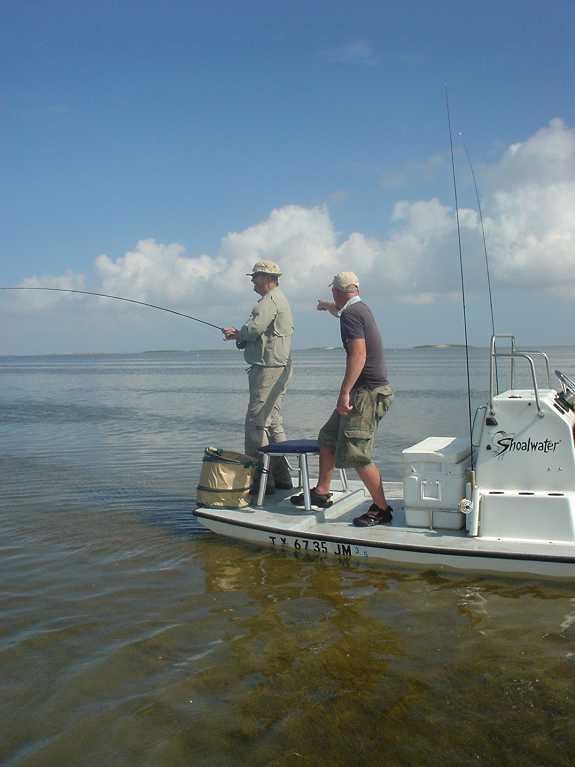 Bill hooks up with what could be an imaginary redfish. Paul helps by pointing into the distance. There aren't any fish where Paul is pointing, so that's a big help, Bill says.Rick says, "Goddam I've hooked the ceiling"