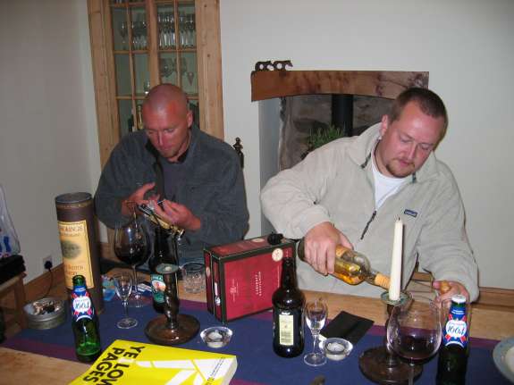 The flytying begins... there does appear to be quite a lot of alcohol in this picture, but there were ten of us and so that's okay then. Here I'm tying a special little nymphet while Lars is busying himself with a toast to my flytying skills. Both Lars and Al (and all the other seven people in the room) were most impressed with my flytying skills and Lars said he may even write a book about it one day. You'll also notice the Yellow Pages, we'll be finding out what that's all about later, when Al writes about the trip.