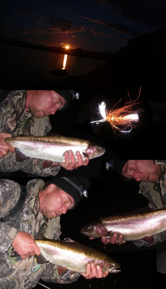 Three fish to the Shipmans as the moon was coming up. I know I've said it before but I really do well with this fly and have caught many thousands of fish using it. It's a dryfly/emerger sort of thing. Didn't get onto the water until evening but I needn't have rushed. Spent an interesting couple of hours trying to catch the only rising fish on the lake. At a guess I'd estimate him to have been between 8 and 10lbs. Turned him twice but no take. At this point things weren't looking good and God was starting to talk to me. I gave the dam another stroll and found two fish rising along the very edge. Difficult casting since the line had to land on the rocks and not in the gaps, you had to be accurate, and it was pretty dark. I landed both of course (this is Sexyloops) and then found another fish rising on the edge of the ripple, which took my fly after I started singing to it (the fish, not the fly). It's nice to pull it out the bag at the end like that and I'm relieved not to have blanked here two trips in a row. That would have really sucked, especially since I'd have had to tell you. Nice fish, three fish for thirteen pounds. Notice the red eyes; it's always like that after a Middlemarch Meet. It's funny how we go red eyed and fish go white eyed. I must find ot why that is...