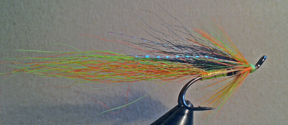 Tail: Chartreuse and orange bucktail mixed, sparse.