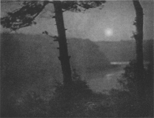 The sun and the tall green trees and rose hipped undergrowth of the far shore viewed grey…..
